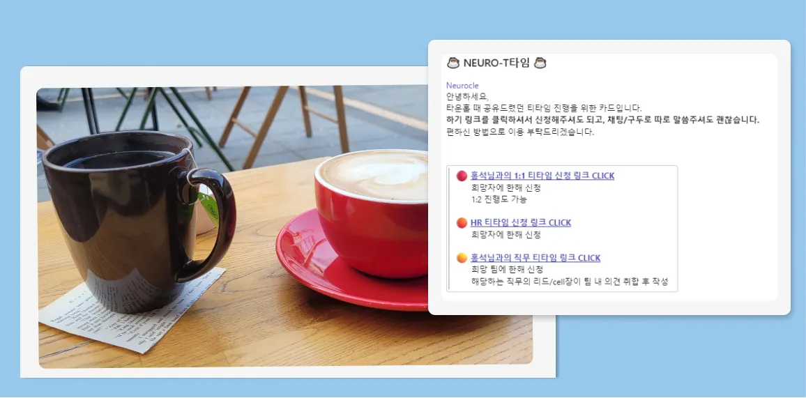 CEO이신 홍석님 혹은 HR과 카페에서 티타임을 하며 원하는 주제로 대화하는 시간입니다. 그동안 일 때문에 바빠 그동안 나누지 못했던 성장에 대한 이야기, 회사에 대한 비전과 운영 철학에 대한 이야기, 그 외에 CEO 혹은 HR과 나누고 싶은 이야기들을 자유롭게 공유합니다.